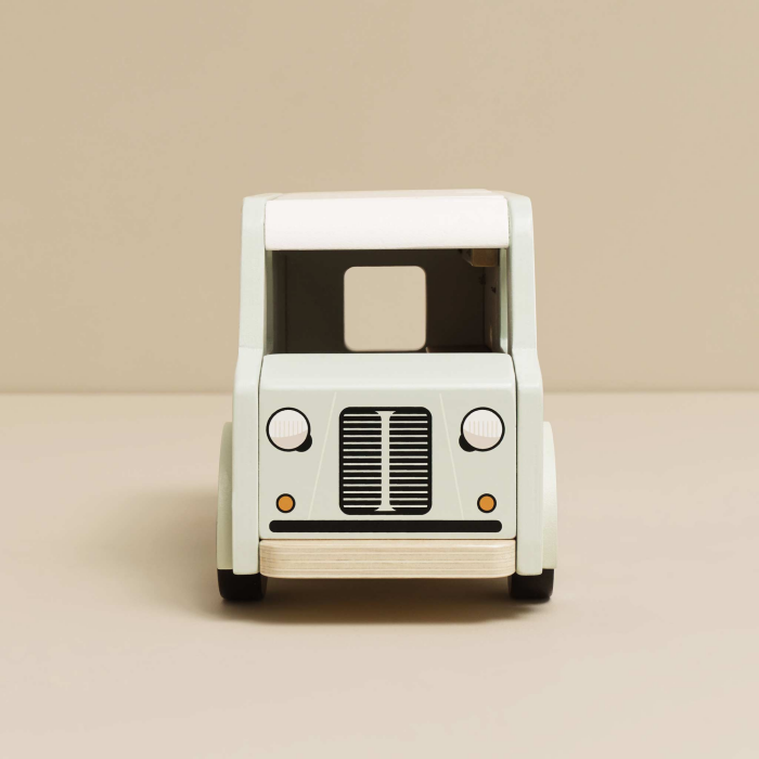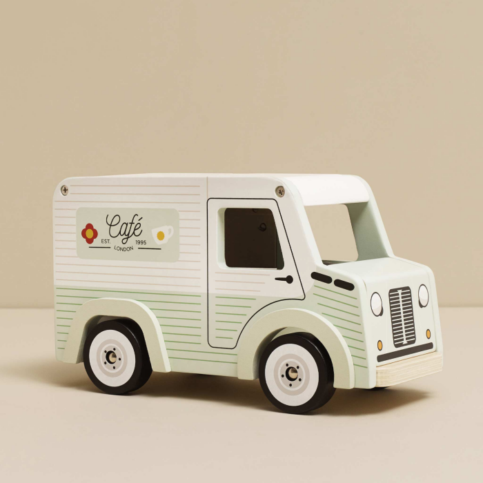 Izrađen od FSC® certificiranog drva u pistacija zelenoj i bijeloj boji, autić oduševljava detaljnim ilustracijama sa svih strana. Krov se otvara kako bi otkrio ploču s izbornikom kave i čaja, dok prednji otvarajući prozor omogućuje malim baristima da poslužuju svoje goste.