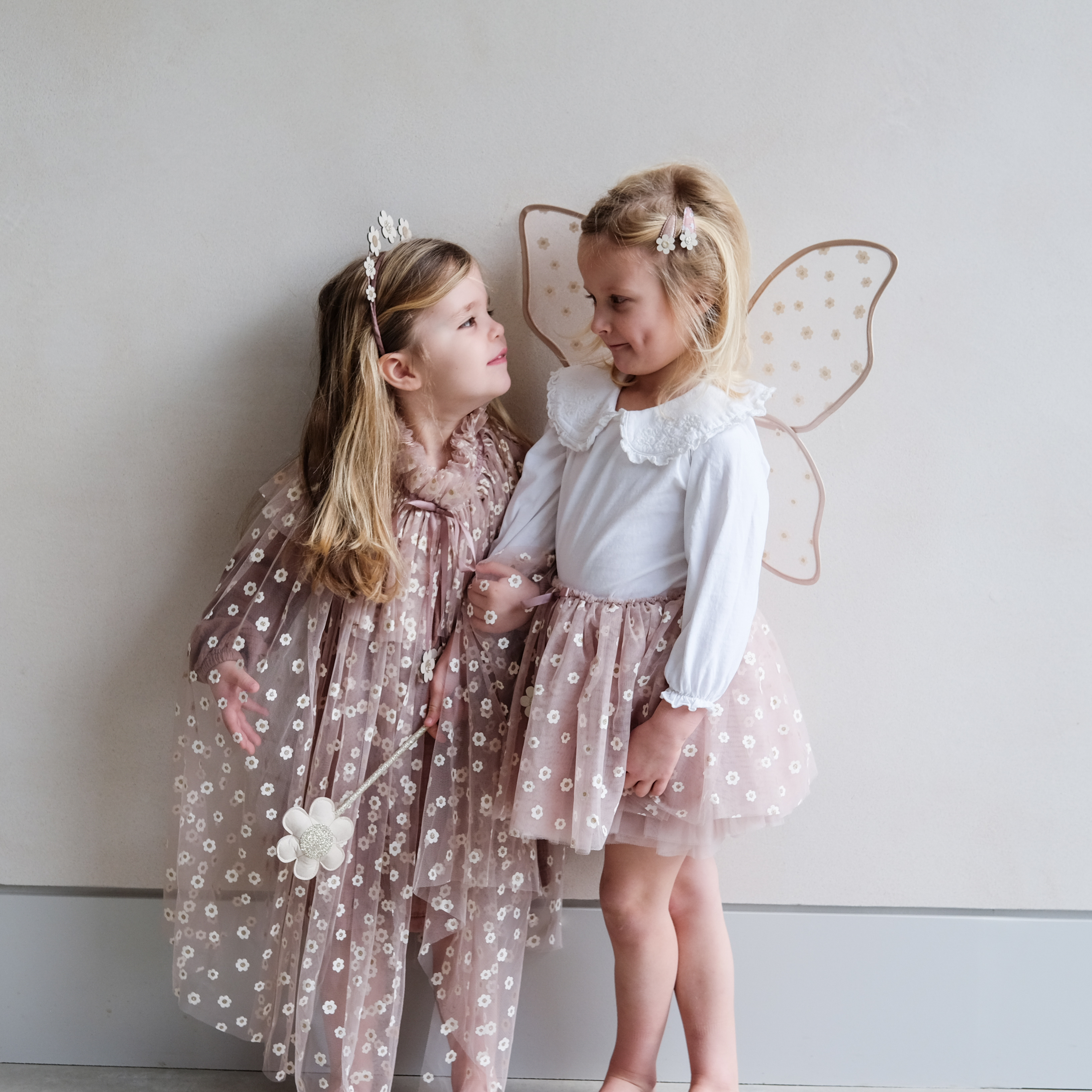Baršunasta šišmiš krila mekana su i lagana, s elastičnim naramenicama koje omogućuju slobodno kretanje i bezbrižno mahanje krilima. Uz njih dolazi i razigrani Mimi & Lula rajf s motivima Noći vještica, savršen mali detalj koji frizuru pretvara u kostim u nekoliko sekundi. Šišmiš torbica zaokružuje cijelu priču i spremna je čuvati slatkiše i tajne pronađene putem.