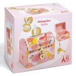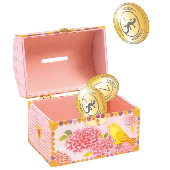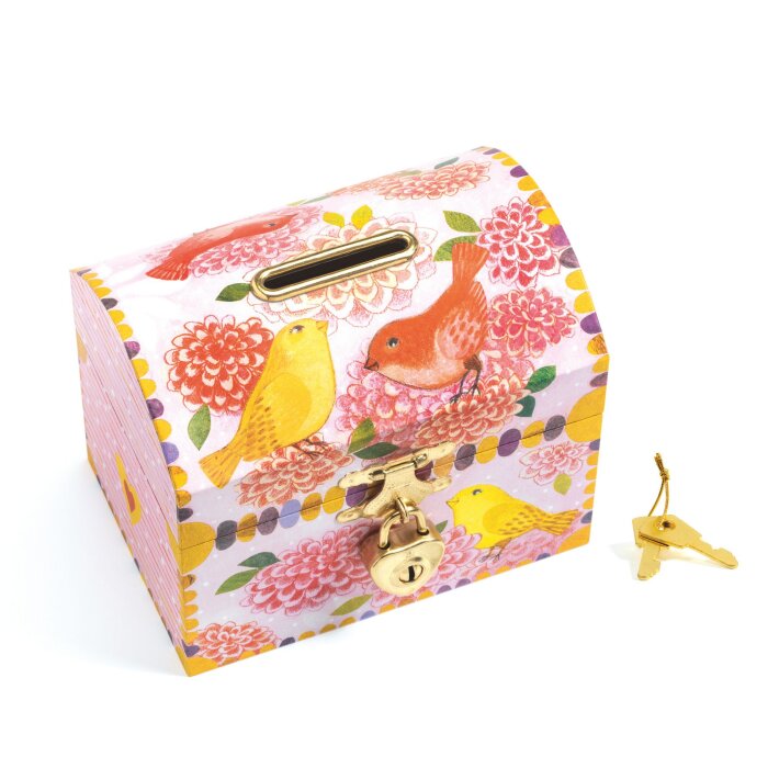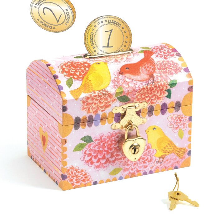 Ukrašena romantičnim ilustracijama cvijeća i ptica, ova kasica potiče djecu na štednju kroz igru i razvija osjećaj odgovornosti prema novcu. Zahvaljujući metalno ojačanom otvoru na vrhu, ubacivanje kovanica je jednostavno i sigurno, bez oštećenja drva.