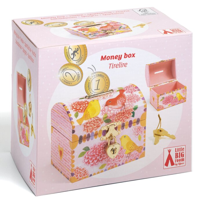 Kasica dolazi s lokotom i dva ključa, omogućujući djeci da sigurno čuvaju svoje male ušteđevine. Donji dio obložen je mekanim baršunom koji štiti površine od ogrebotina, čineći ovu kasicu idealnim dekorativnim dodatkom za dječju sobu. Izrađena od FSC® certificiranog drva.