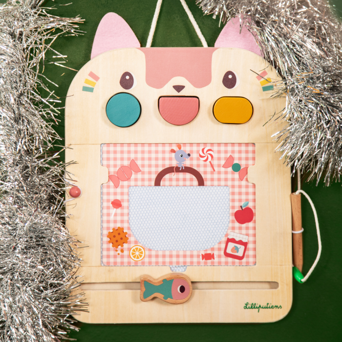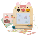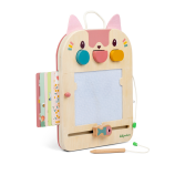 Ova drvena ploča s likom mace Jeanne omogućuje djeci crtanje, igru i razvoj kreativnosti kroz 6 dvostrano tiskanih kartica – ukupno 12 različitih aktivnosti. Drvena olovka povezana je sigurnosnom vezicom, ali se može i odvojiti, a ploča nudi i 3 šarena oblika (plavi krug, žuti oval, ružičasti polukrug) za još više kreativnih crteža.