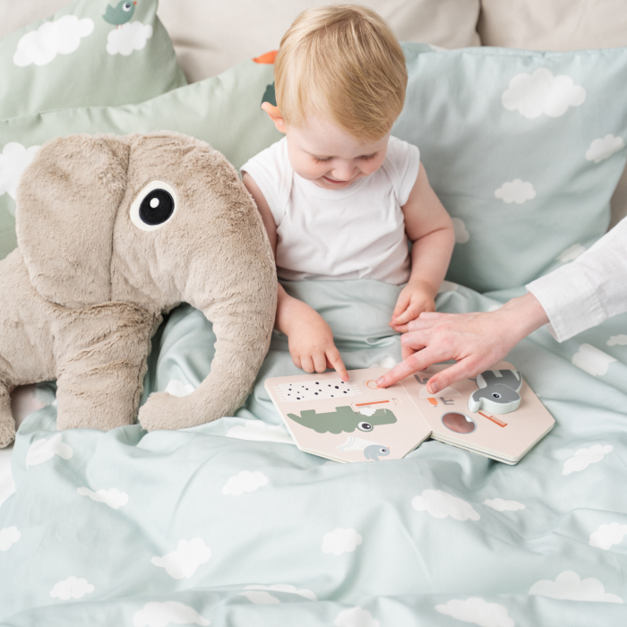 U nježnoj plavoj nijansi, s motivima slonića Elpheeja i ptičice Birdee među oblacima, ova posteljina donosi toplinu i čaroliju u bebinu sobu. Set uključuje jastučnicu i navlaku s praktičnim patentnim zatvaračima za sigurnost i jednostavno korištenje. Dolazi u slatkoj pamučnoj torbi, idealnoj i za pohranu igračaka, odjeće ili sitnica. Deer prijatelji pratit će mališane u sigurne i mirne snove svake noći.