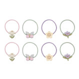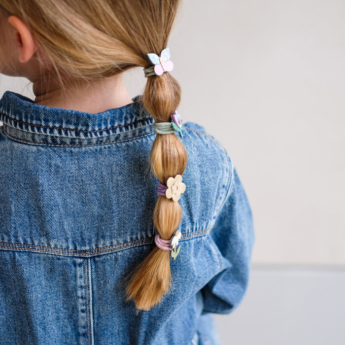 Ovaj set sadrži 8 elastičnih gumica promjera 5 cm, rastezljivih i čvrstih, idealnih za sitne dječje vlasi i svakodnevne frizure. Svaka gumica ukrašena je malim cvjetićima i leptirićima, pažljivo izrađenima od kombinacije mekanog materijala, glittera i metalik tkanina, pružajući razigran i šarmantan proljetni detalj koji će razveseliti svaku malu ljubiteljicu cvijeća i bajkovitih dodataka za kosu.