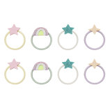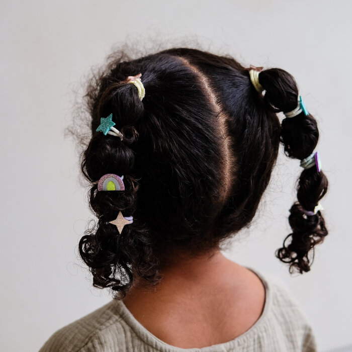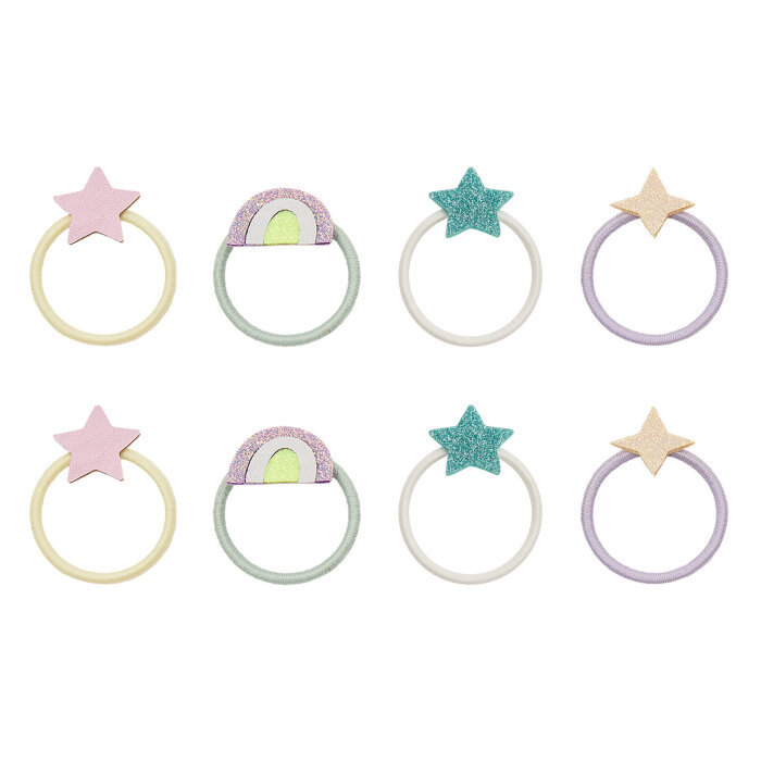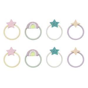 Ovaj set sadrži 8 elastičnih gumica promjera 3 cm, dovoljno rastezljivih, a opet čvrstih, idealnih i za najtanju kosicu. Svaka gumica ukrašena je dugama i zvjezdicama izrađenima od svjetlucavog glittera i mat metalik tkanina, pružajući savršen blistavi završni izgled za svakodnevne igre, rođendanske zabave ili posebne prilike.