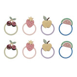 Ovaj set sadrži 8 elastičnih gumica promjera 3 cm, rastezljivih i čvrstih, idealnih za tanku dječju kosicu i svakodnevne frizure. Svaka gumica ukrašena je razigranim voćnim motivima izrađenima od kombinacije glittera i metalik tkanina, donoseći zabavan i ljetni izgled koji će razveseliti svaku malu ljubiteljicu boja i veselih dodataka za kosu.