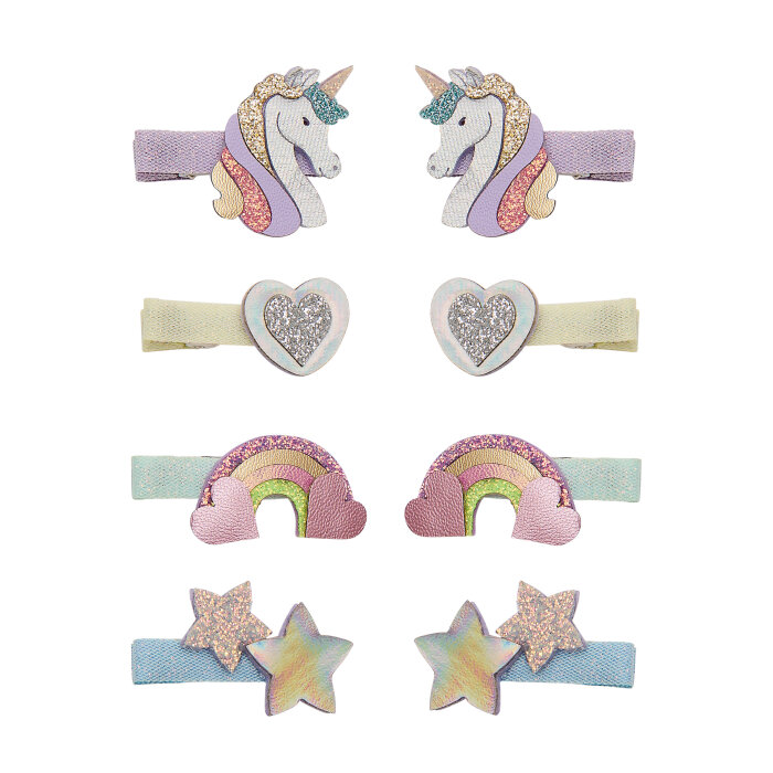 Ove preslatke mini špangice u nježnim pastelnim bojama savršen su dodatak za svaki dan ili posebne prilike. Ukrašene jednorozima, duginim bojama, srcima i zvjezdicama, oduševit će svaku malu ljubiteljicu bajki.