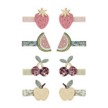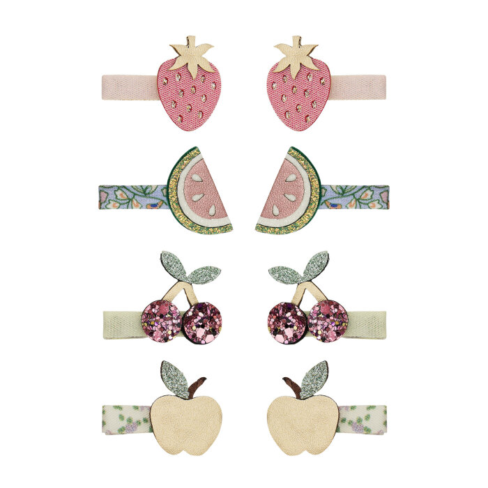 Ovaj set sadrži 8 mini špangica veličine 3 cm, obloženih tkaninama u nježnim pastelno-cvjetnim tonovima, savršenih za sitne vlasi i razigrane frizure. Svaka špangica ukrašena je sočnim voćnim motivima izrađenima od kombinacije glittera i metalik tkanina, donoseći zabavan, razigran i ljetni izgled koji će razveseliti svaku malu ljubiteljicu boja i veselih dodataka za kosu.
