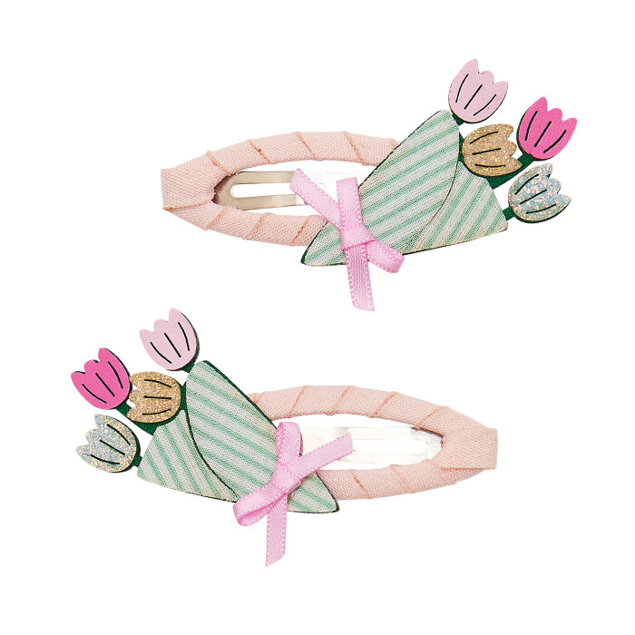 Ovaj set sadrži 2 clic-clac špangice veličine 5 cm, obložene trakom za udobno i sigurno nošenje. Svaka špangica ukrašena je malim buketom šarenih tulipana vezanim ružičastom mašnicom, izrađenim od kombinacije prugastih, glitter i mekanih tkanina. Savršen je detalj za razigrane frizure i šarmantne outfit kombinacije, idealan za svakodnevne igre ili posebne prilike.