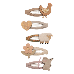 Dječje špangice Farma donose šarm i pretvaraju svaku frizuru u zabavnu pustolovinu. U pakiranju dolazi 5 špangica veličine 4 cm s klik-klak kopčama obloženima kombinacijom svjetlucavih i mat tkanina. Ukrašene preslatkim motivima životinjica s farme – pilića, ovčice i miša – te cvjetićem i srcem, ove špangice unose razigranost i vedrinu u svaki dan. Savršene su za male istraživačice koje vole šarmantne i zabavne detalje.