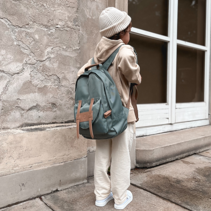 Ruksak ima termo jastučić za sjedenje koji grije tijekom odmora, termo-džep za bočicu koji održava temperaturu napitka, te podesive, podstavljene naramenice s pametnom magnetskom kopčom koja sprječava klizanje s ramena. Zahvaljujući patentnom zatvaraču koji se otvara od vrha do dna, vaš mališan brzo pronalazi sve što traži – pogotovo kekse! Detalji od veganske kože daju mu dodatnu notu stila i kvalitete. Unutar ruksaka nalazi se i oznaka za upis imena i broja telefona, kako bi uvijek znao put nazad kući.