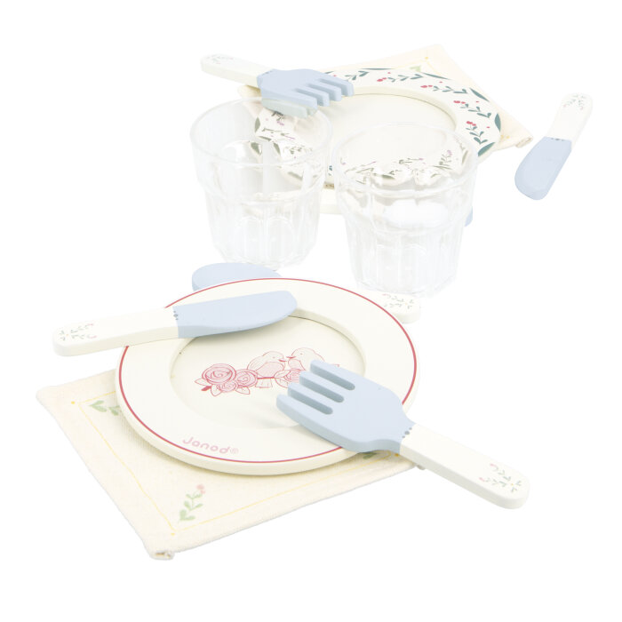 Set sadrži posuđe za 4 osobe: 4 drvena tanjura s cvjetnim motivima, 4 krpene salvete, 4 kompleta pribora za jelo (žlice, vilice i noževi) te 4 retro plastične čaše. Djeca kroz igru imaju priliku oponašati odrasle, razvijati maštu i učiti svakodnevne vještine poput serviranja, pospremanja i postavljanja stola.