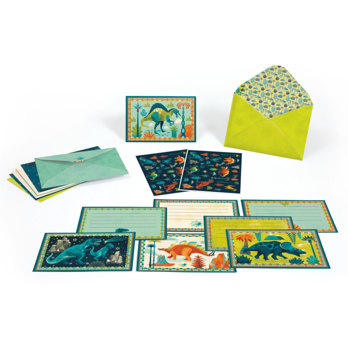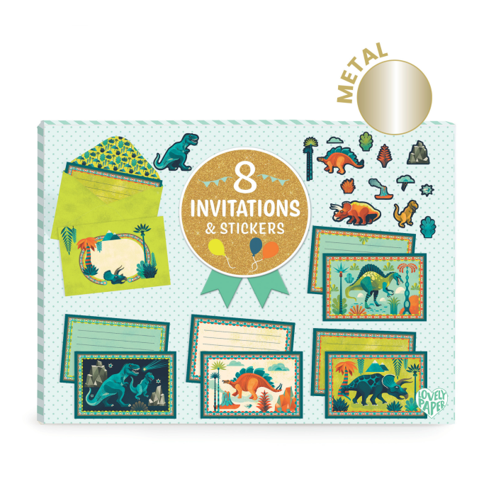 Ovaj zabavni set s dino temom uključuje 8 ilustriranih pozivnica, 8 šarenih omotnica i 2 lista naljepnica za potpuno personalizirane poruke. Kombinacija metalik efekta i mat otiska daje svakom dizajnu elegantan i originalan izgled, dok visokokvalitetni FSC® papir osigurava prekrasan završni dojam.