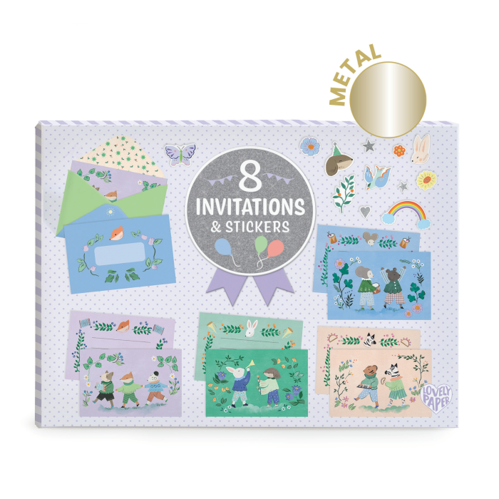 Ovaj čaroban set s motivom životinjica uključuje 8 ilustriranih pozivnica, 8 šarenih omotnica i 2 lista naljepnica za potpuno personalizirane poruke. Kombinacija metalik efekta i mat otiska daje svakom dizajnu elegantan i originalan izgled, dok visokokvalitetni FSC® papir osigurava prekrasan završni dojam.