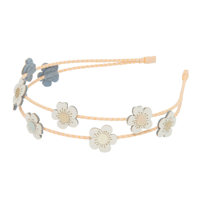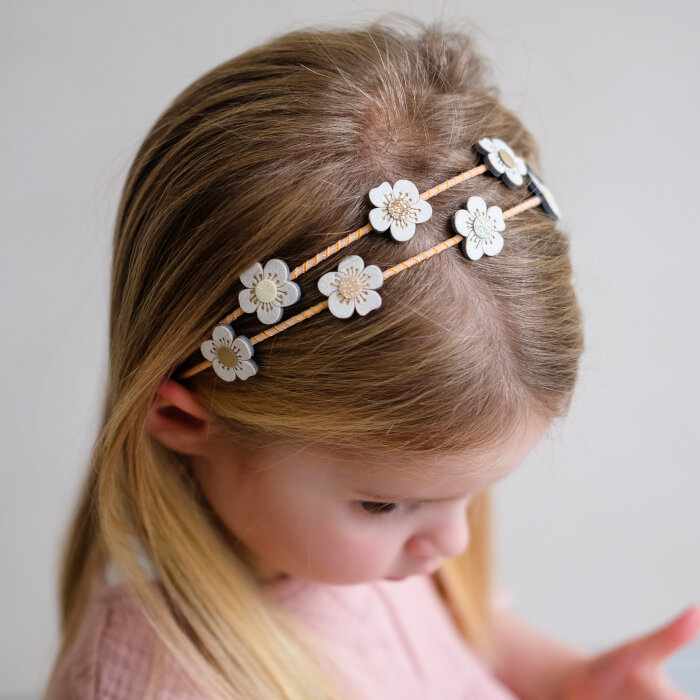 Rajf za djecu od 3 do 10 godina ima dvije vrpcom obložene trake i ukrašen je s devet prekrasnih cvjetića u neutralnim tonovima koji se slažu sa svakim stilom. Cvjetovi su izrađeni od mekanih, glitter i metalik tkanina, dajući veseli i nježan detalj koji savršeno upotpunjuje proljetne i ljetne frizure.