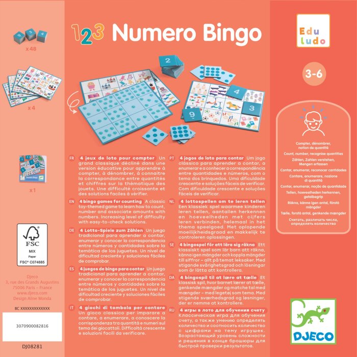 Set sadrži 4 bingo igre s temom igračaka, osmišljene kako bi djeci pomogle u savladavanju osnovnih matematičkih vještina važnih za polazak u školu. Djeca uče brojati, povezivati brojeve s količinama i razvijati logičko razmišljanje, uz postupno povećavanje razine težine. Pravila su jednostavna i lako razumljiva, a rješenja su dostupna na kraju knjižice za brzu i jednostavnu provjeru. Igra je izrađena od FSC® certificiranog papira i kartona.