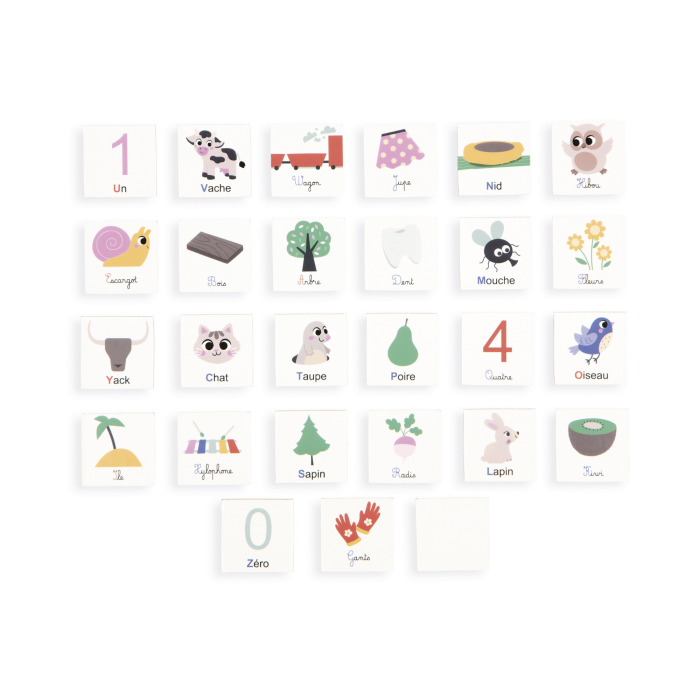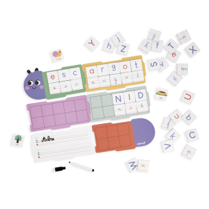 Igra sadrži 6 ploča, 78 slova, 26 kartica s ilustracijama i marker za višekratno pisanje. Razvijena u suradnji s psihomotorikom, igra potiče prepoznavanje i pisanje slova kroz više razina težine, uz mogućnost slaganja ploča i pisanja riječi. Idealna je za samostalno učenje ili igru s roditeljem, izrađena od FSC™ certificiranog drva i kartona.