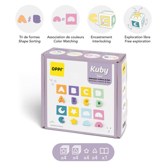 Set uključuje slova ABCD kao i oblike inspirirane nebom - dugu, oblak, zvijezdu i mjesec - koji djeci pomažu u ranom upoznavanju slova i oblika, dok istovremeno potiču kreativnost i samostalno istraživanje.